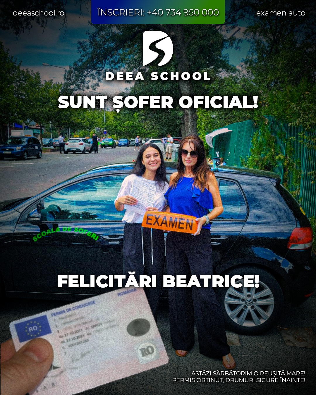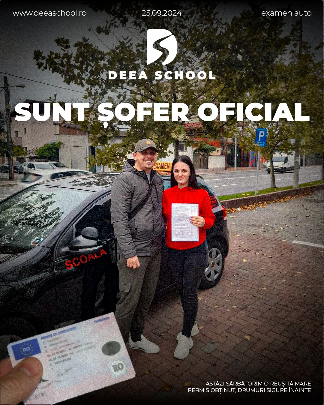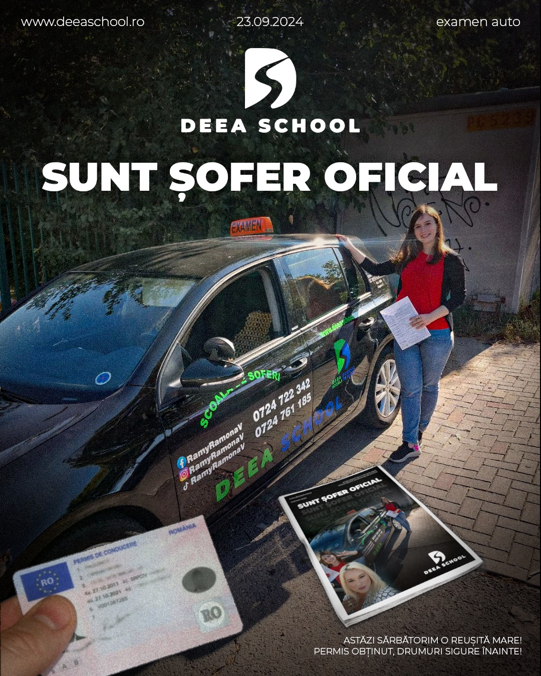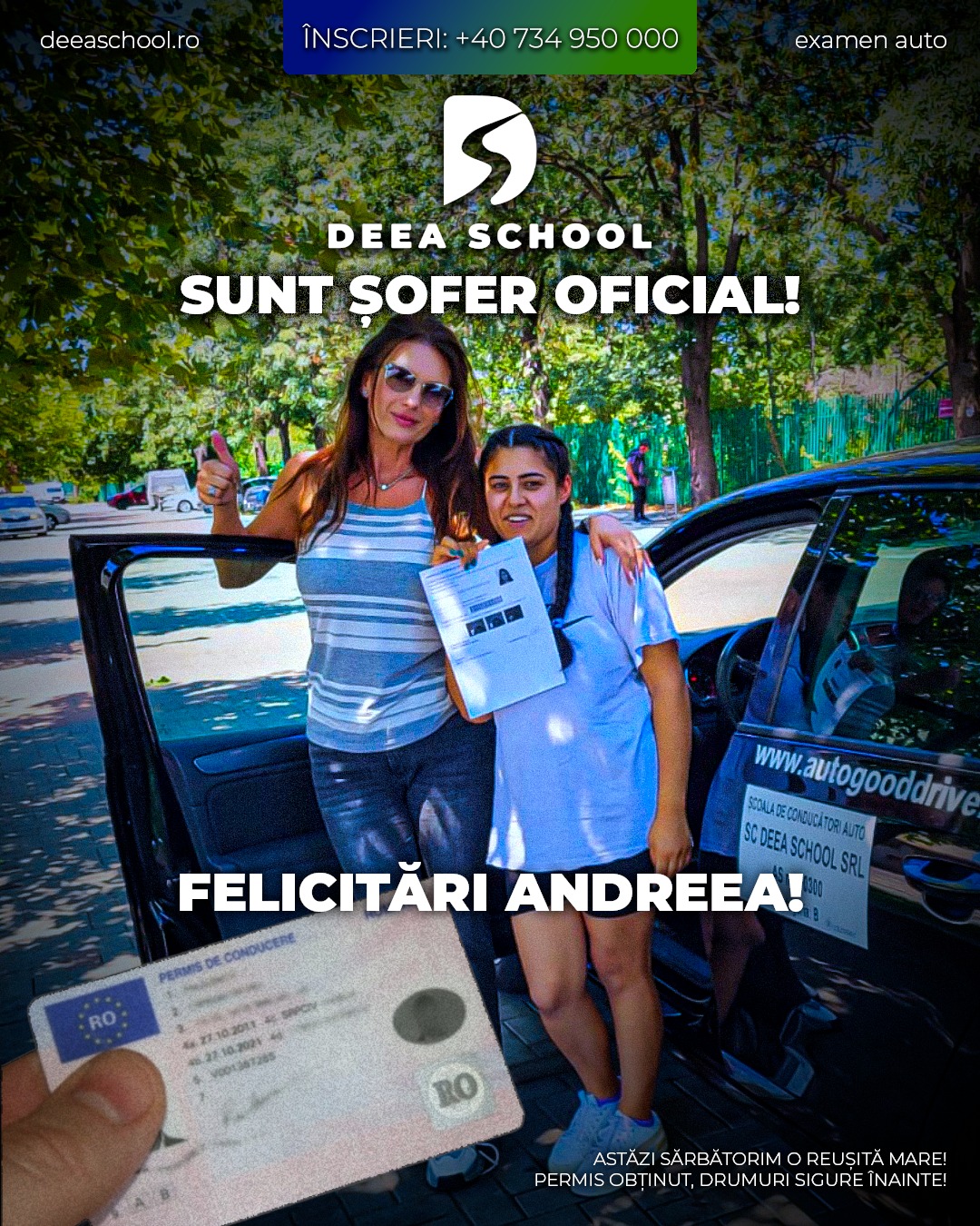 La Deea School – Școala de Șoferi din Sector 3, succesul fiecărui cursant este și succesul nostru! De-a lungul anilor, am pregătit cu pasiune sute de elevi care și-au obținut permisul de conducere, pornind astfel încrezători pe drumurile din România. În această secțiune, vă prezentăm mândri o galerie de imagini cu cursanții noștri care au absolvit și au promovat examenul auto cu succes!