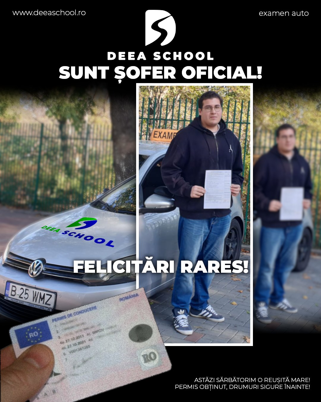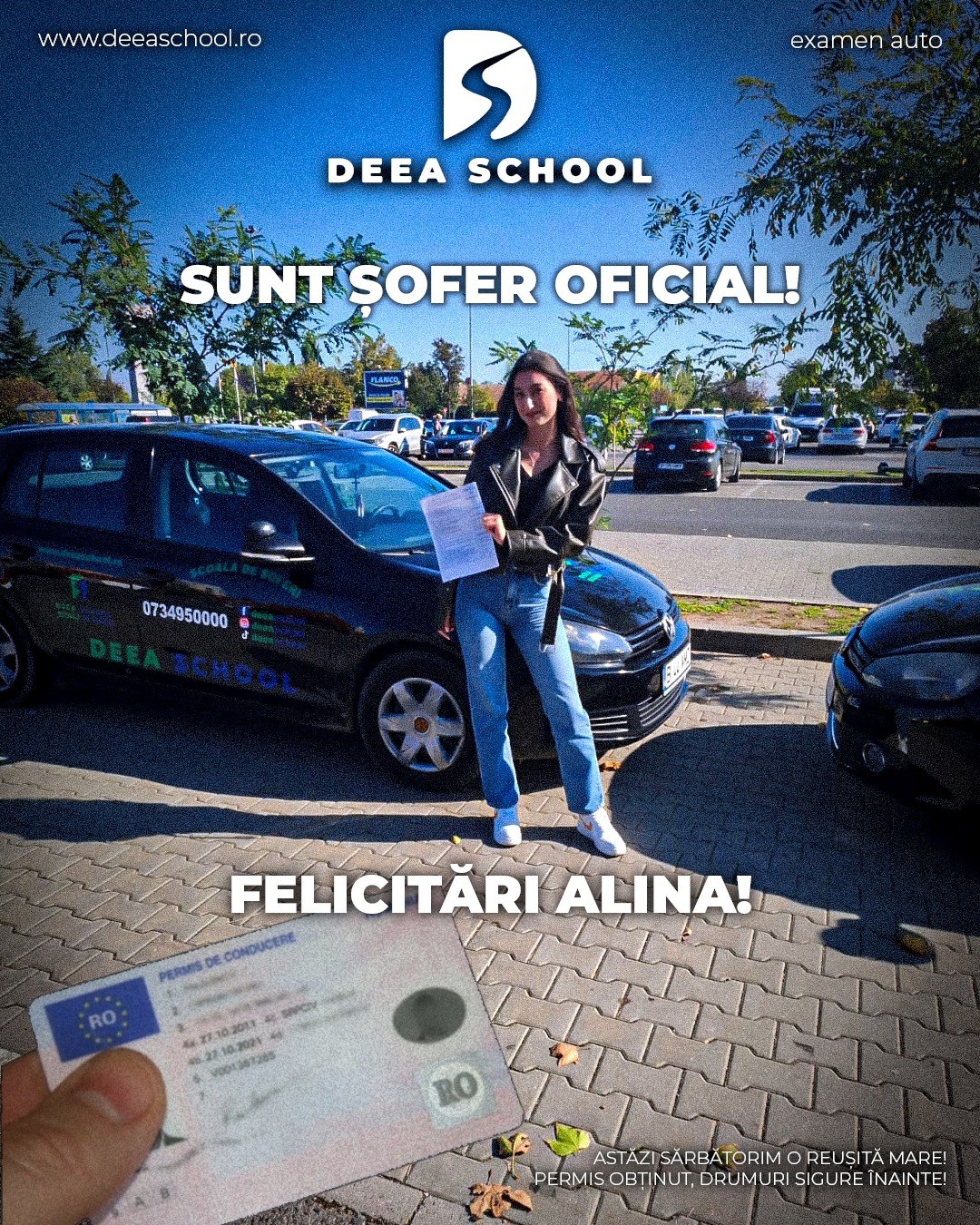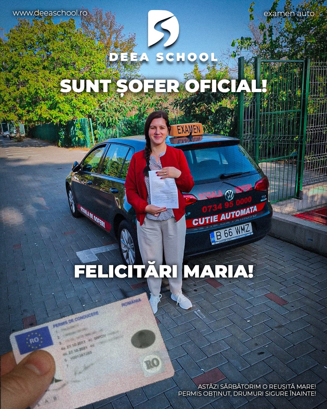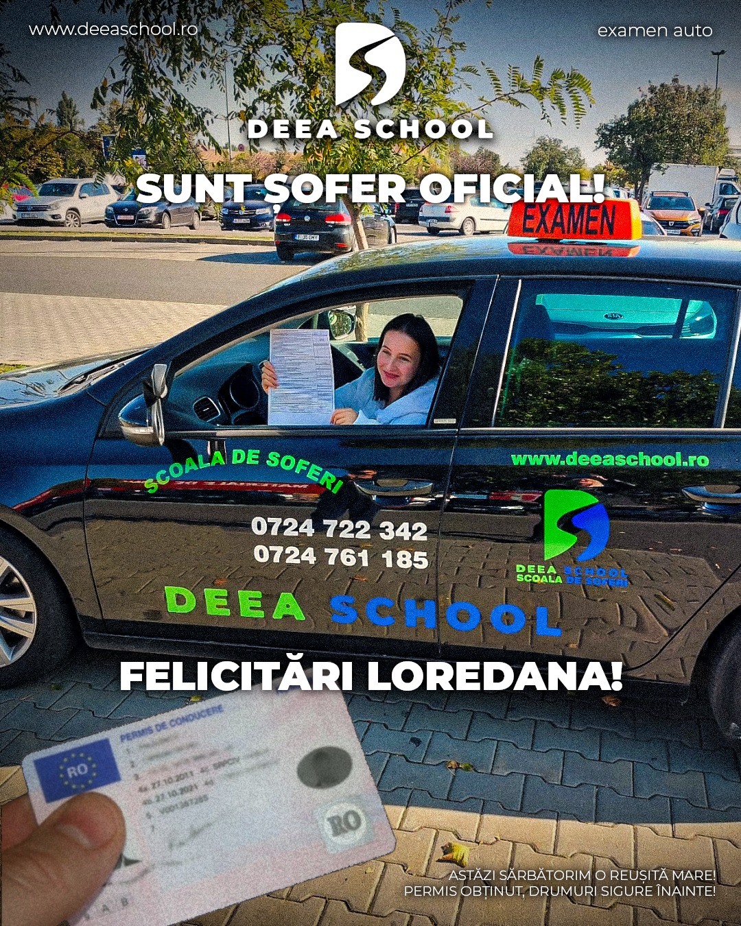 La Deea School – Școala de Șoferi din Sector 3, succesul fiecărui cursant este și succesul nostru! De-a lungul anilor, am pregătit cu pasiune sute de elevi care și-au obținut permisul de conducere, pornind astfel încrezători pe drumurile din România. În această secțiune, vă prezentăm mândri o galerie de imagini cu cursanții noștri care au absolvit și au promovat examenul auto cu succes!