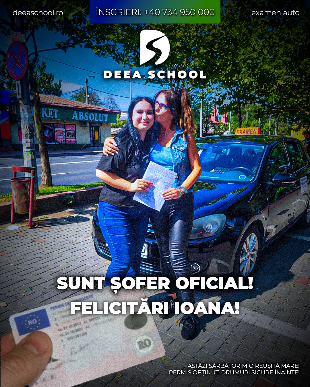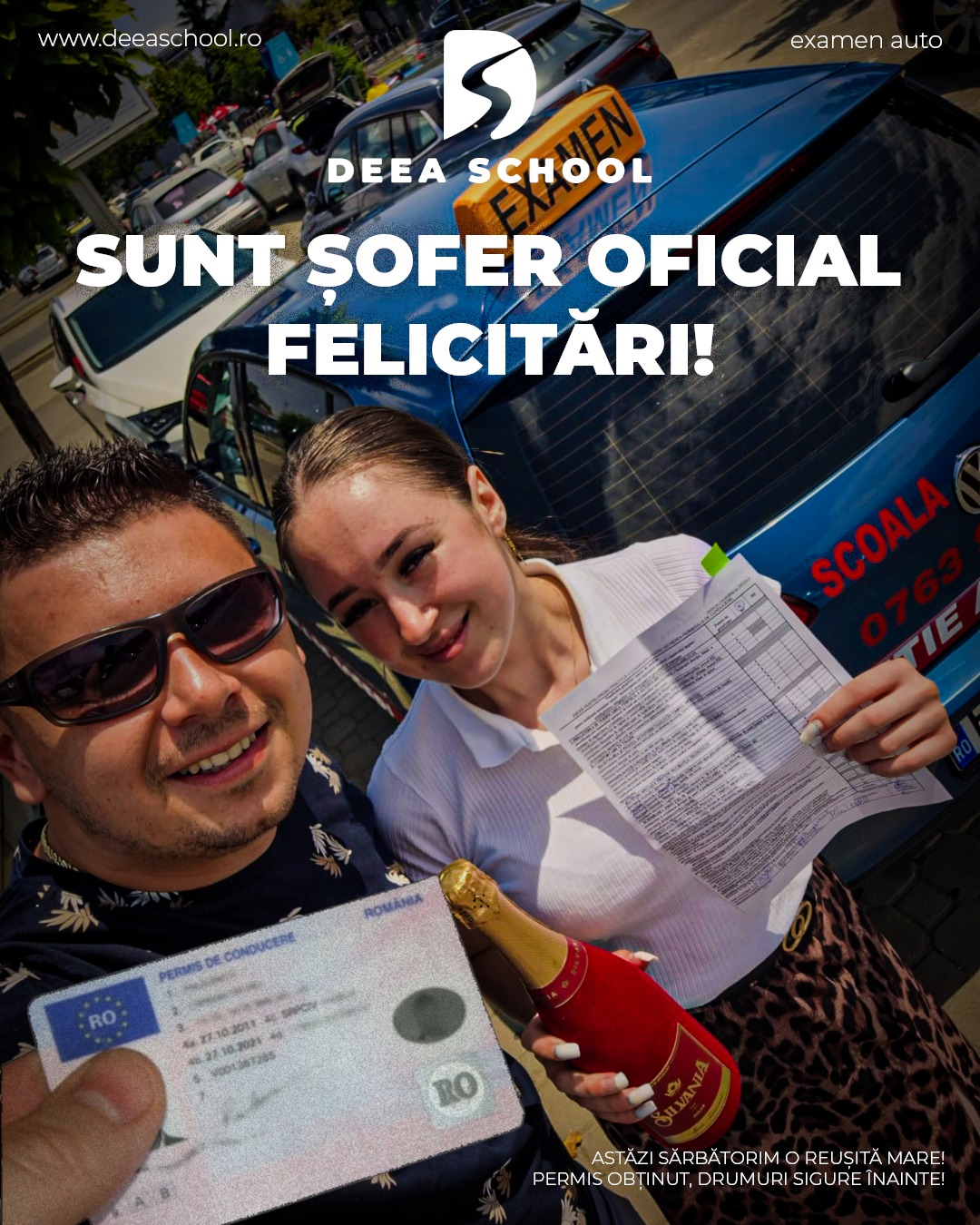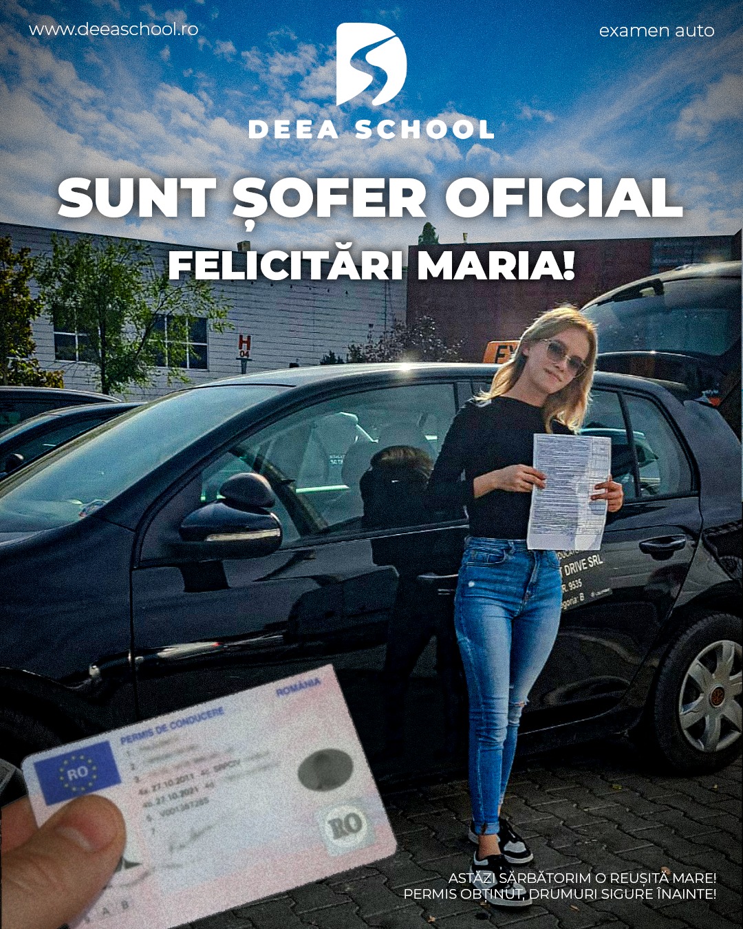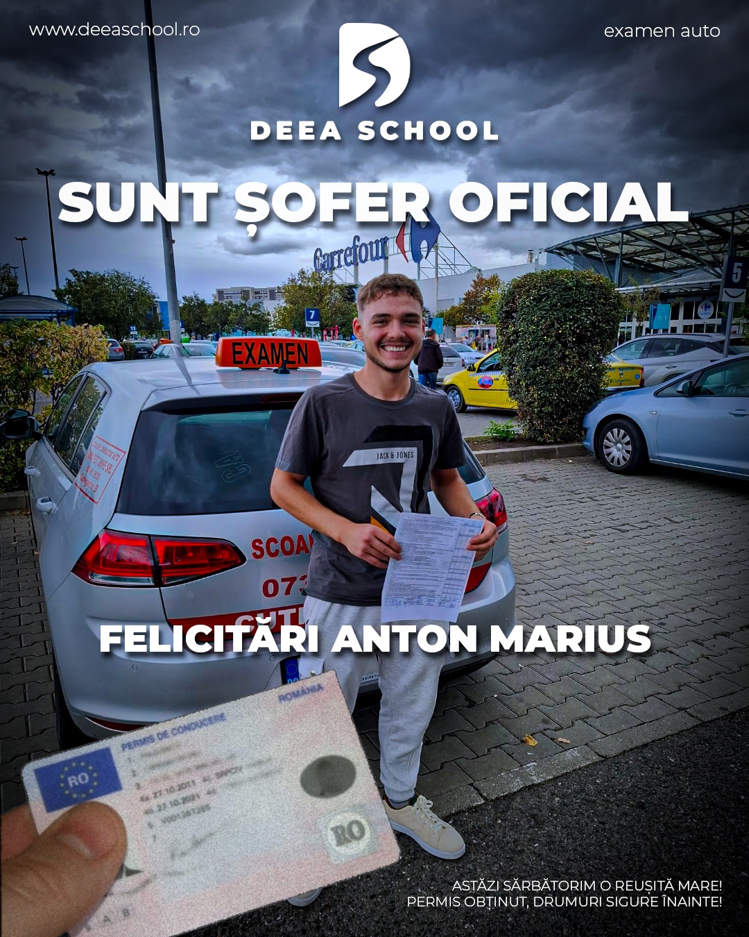 La Deea School – Școala de Șoferi din Sector 3, succesul fiecărui cursant este și succesul nostru! De-a lungul anilor, am pregătit cu pasiune sute de elevi care și-au obținut permisul de conducere, pornind astfel încrezători pe drumurile din România. În această secțiune, vă prezentăm mândri o galerie de imagini cu cursanții noștri care au absolvit și au promovat examenul auto cu succes!